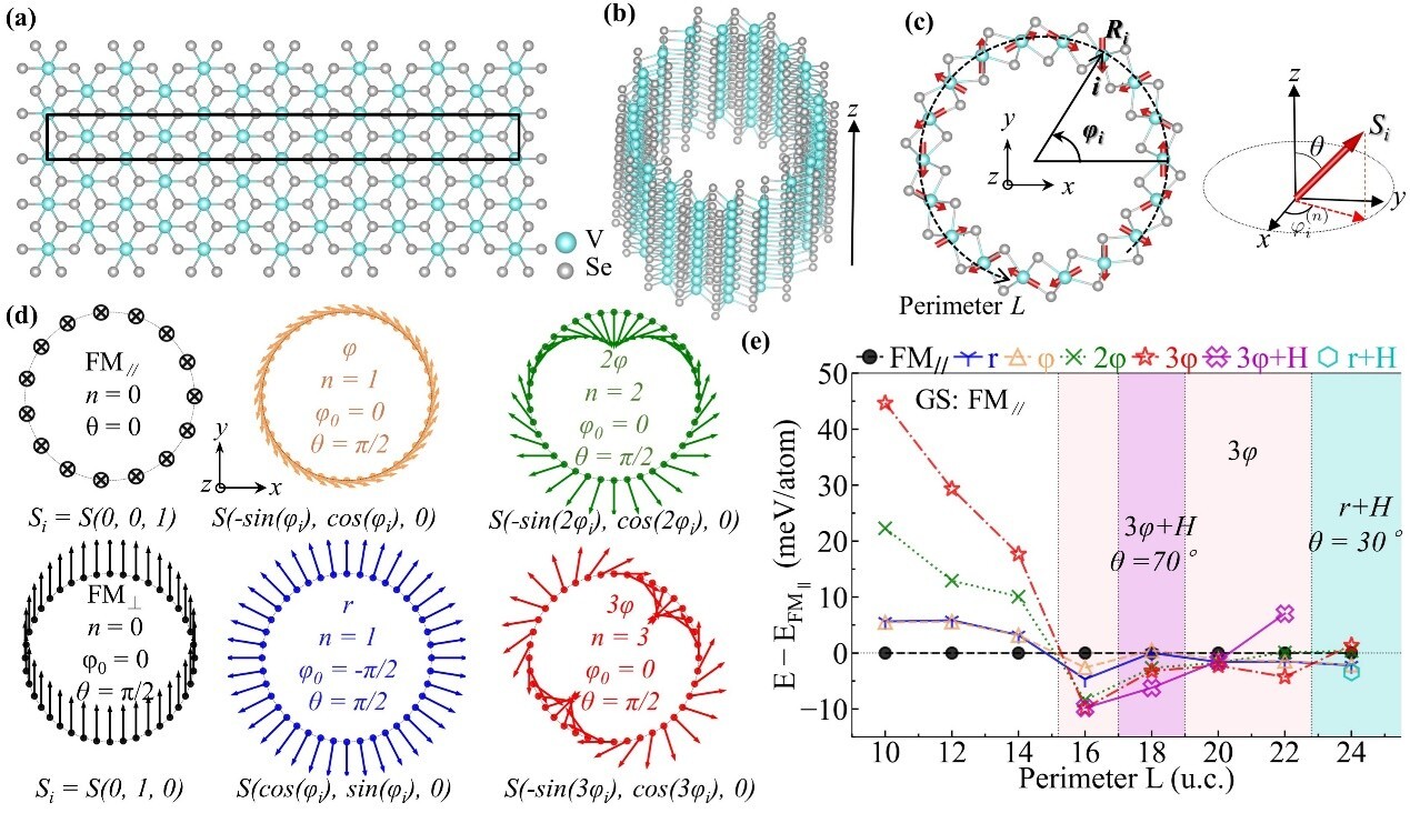 Researchers have discovered diameter-controlled high-order vortex states and magnon hybridization in vanadium diselenide (VSe2) single-walled nanotubes.