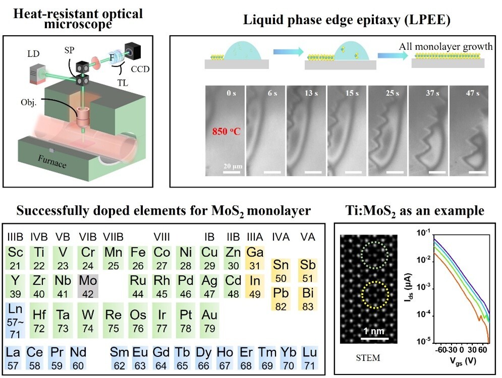 To address this challenge, the "2D semiconductor" research group of NCNST has developed a general doping approach. First, the team developed a high-temperature resistant optical microscope capable of withstanding temperatures up to 950°C. This innovation acts like installing an eye inside the CVD, enabling real-time, in-situ observation of the growth process of MoS2 monolayer. This provided an unprecedented perspective on the crystal growth dynamics (Nano Lett.2024, 24, 5498). Leveraging this unique observational capability, they subsequently developed the Liquid Phase Edge Epitaxy (LPEE) technique for growing TMD monolayer (J. Am. Chem. Soc.2023, 145, 11348). This method laid the foundational approach for intentionally introducing dopant elements during the growth of 2D materials.