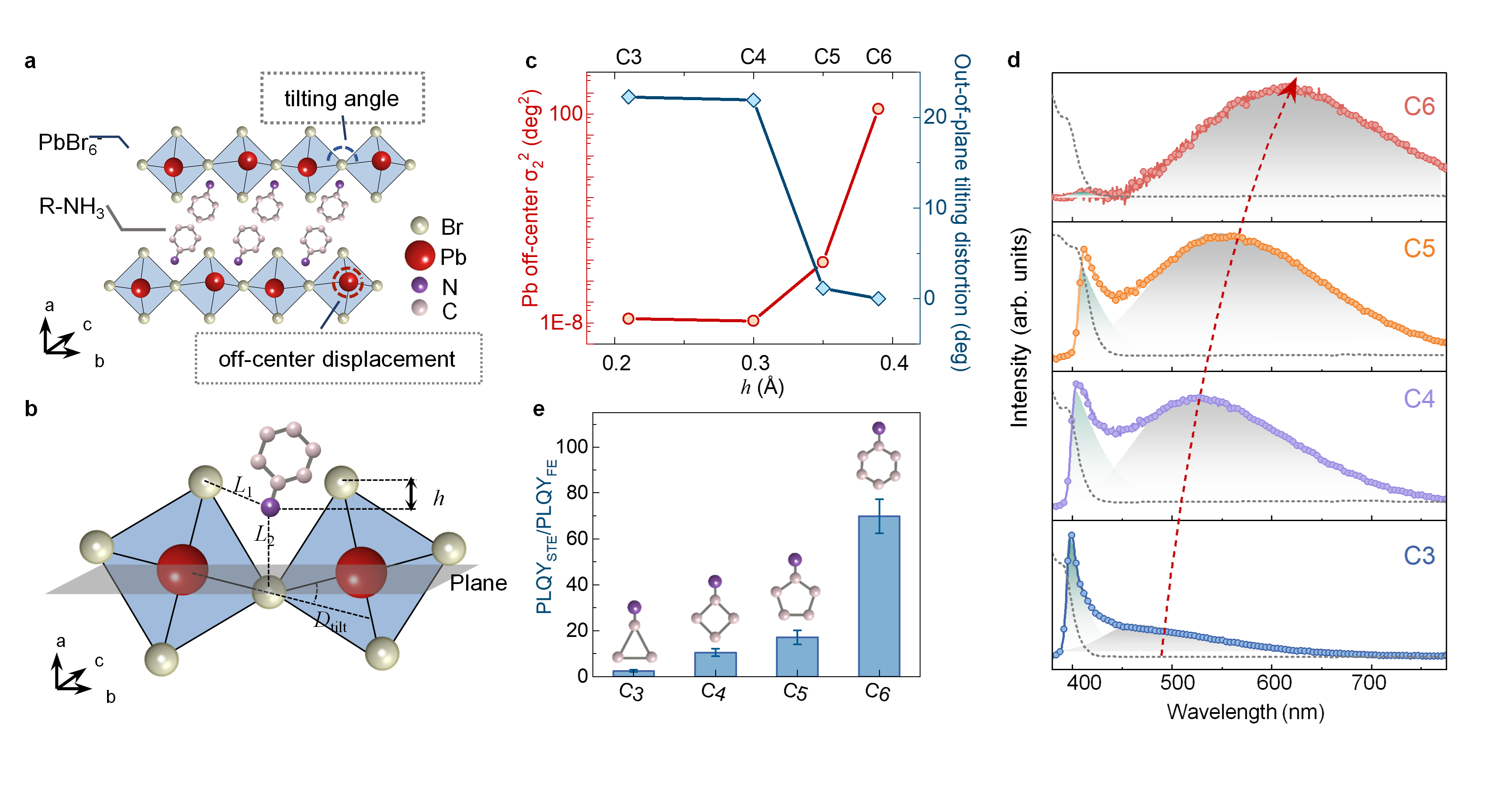 The research team innovatively selected a series of two-dimensional lead bromide perovskites ((R-NH₃)₂PbBr₄, where R represents C3-C6 cyclic carbon chains) with the same structural type but cyclic organic cations of different ring sizes as the research objects. By precisely regulating the steric hindrance effect of organic cations, they systematically investigated the influence of structural distortion on luminescent properties. The study found that with the increase in the ring size of cyclic organic cations, the relative STE emission intensity and phonon coherence intensity are significantly enhanced due to the strengthened electron-phonon coupling strength. This enhanced STE emission is closely correlated with the Jahn-Teller distortion induced by Pb off-center displacement, rather than the octahedral tilting distortion. Furthermore, density functional theory (DFT) calculations show that the enhanced Jahn-Teller distortion leads to an increase in exciton self-trapping energy and Stokes shift. Our research results provide fresh insights into understanding the correlation between structural distortion and STE emission properties, which not only holds important fundamental research significance but also has great value for guiding the design and optimization of perovskite-based single-emitter w-LEDs.