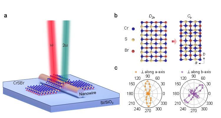 The team innovatively integrated CrSBr flakes with aligned silver nanowires. The silver nanowires not only provide plasmonic near-field enhancement but also apply controllable nanoscale uniaxial strain at the contact regions. This strain drives a persistent structural phase transition in the material from an orthorhombic system (D2h point group) to a monoclinic system (Cs point group), thereby inducing local lattice symmetry breaking in CrSBr and realizing lattice reconfiguration at the microscopic scale. By altering the alignment direction of the silver nanowires (i.e., the strain axis), the material's second-order nonlinear susceptibility was further effectively modulated.